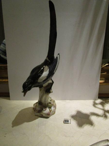 Figura a decorazione policroma di una gazza ladra. L'animale è nero con parte delle ali bianche, è raffigurato appollaiato su un albero chiaro con foglie a rilievo e tocchi di bruno. Il modello a cui si ispira è del 1733 e spetta a K?ndler.