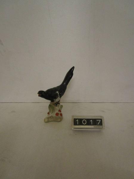 Piccola figura di uccellino a piume nere appollaiato su un tronco d'albero.
