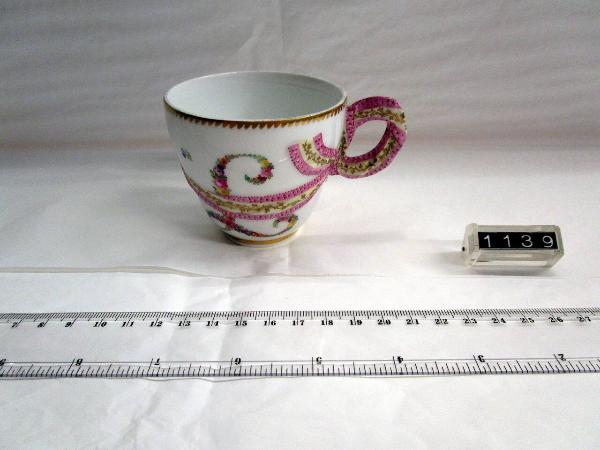 Tazzina a decorazione policroma e oro di fiori sparsi e lettera L formata fa fiorellini. Manico rosa e giallo a foggia di nastro corente lungo tutta la tazzina. Orlo dorato. Piattino corrispondente inv. 1141. Al rovescio la marca: scettro in blu, 41, 21, 11 in porpora.