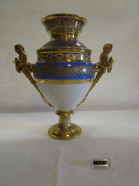Gelatiera con coperchio e con anse antropomorfe (cariatidi?) dorate reggenti una fiaccola. Fondo bianco, decorazione in oro e azzurro di palmette e festoni. Fiaccole scheggiate.