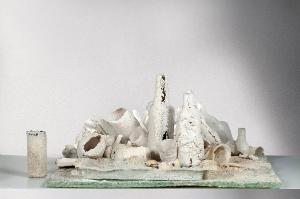 Su un piano rettangolare sono disposti in modo disordinato oggetti frammentari: un vassoio, due bottiglie, bicchieri, vasi. Esterno al gruppo, a sinistra, è appoggiato un bicchiere cilindrico. Vetro incolore.