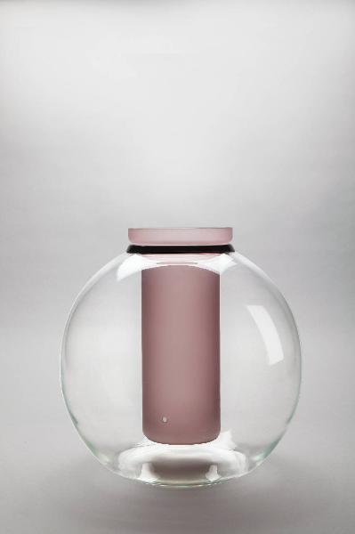 Una sfera di vetro incolore, soffiato a stampo, contiene un cilindro di vetro satinato di colore viola chiaro. Il cilindro è cavo ha il bordo dell'estremità superiore che si appoggia alla bocca del vaso-sfera così da mantenere sospeso il cilindro.