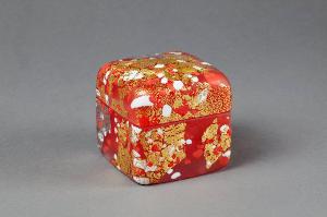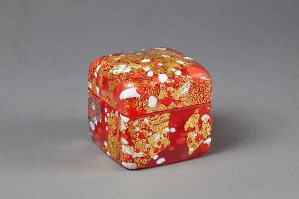 Scatola cubica con coperchio con angoli arrotondati. Colore rosso con elementi decorativi astratti bianchi e a foglia d'oro e d'argento.
