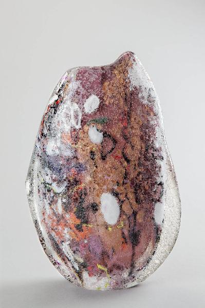 Elemento elissoide, di forma irregolare. Vetro trasparente con corrosione esterna, all'interno decorazione a macchie sui toni del marrone.