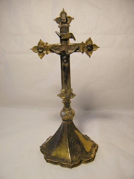 Base ottagonale con bordo liscio, gradino traforato, specchiature alternate, lisce con iscrizione sbalzo e cesello e ornate da girali vegetali. Nodo a sfera sormontato da stemma. Croce, ornata da girali vegetali, presenta terminazioni trilobate a ogiva con gemme incastonate. Sul recto al centro Cristo crocifisso a tutto tondo e all'estremità inferiore del braccio vericale, il cranio di Adamo a rilievo. Sul verso all'incrocio dei bracci la lamina ornata da quattro castoni rettangolari a forma di croce copre una nicchia per la reliquia della Sacra Spina della Corona di Cristo e del Suo manto.