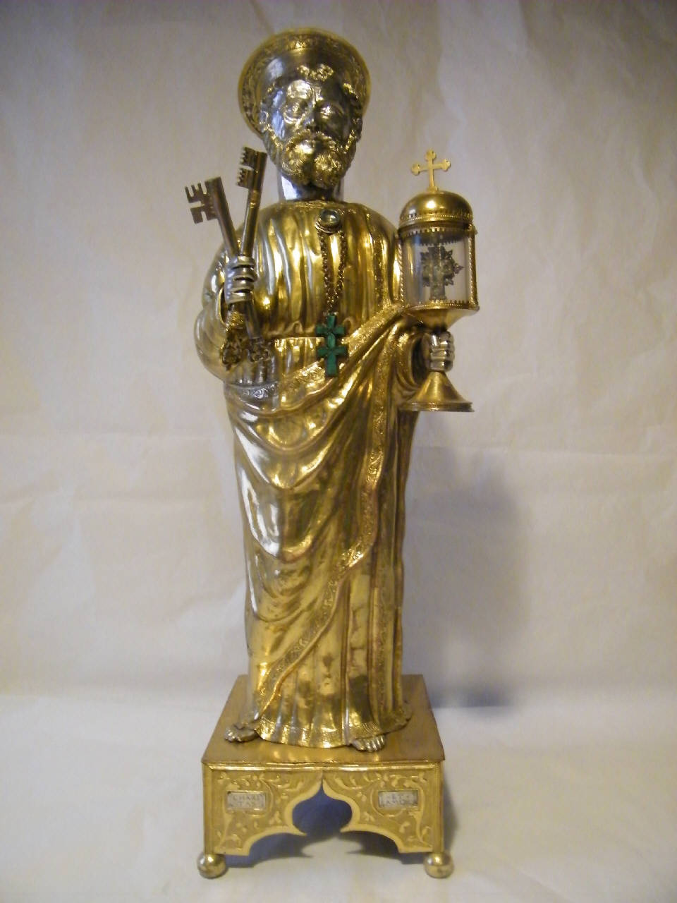 Piccola statua di San Pietro, stante, raffigurato con le chiavi nella mano destra e un reliquiario a ostensorio, della tipologia ambrosiana a tabernacolo con base circolare, nella mano sinistra. Sul petto, entro castone, grande gemma a cabochon. Da questa è appesa una catenella con crocetta a doppio braccio orizzontale, ornata da una lato da malachite e dall'altro dal trigramma di Cristo inciso. La statuetta poggia su una base quadrata con piedini a sferetta e aperture a ogiva su ogni lato, ornata da volute vegetali e, dal lato frontale, da due targhette con iscrizione.