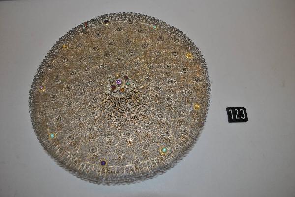 Alzata circolare in filigrana d'argento con volute, fiori e pietre cabochon incastonate.