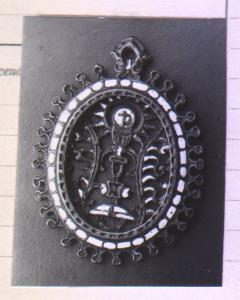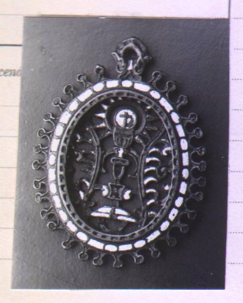 medaglia devozionale di forma ovoidale. Nella parte interna, lavorata a traforo con inserti di smalto cloisonné è rappresentato un calice sovrastato da un'ostia raggiata. La cornice è costituita nella parte esterna da una serie di sporgenze.