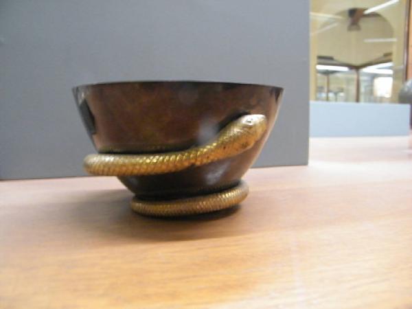 Contenitore emisferico con decorazione di serpe dorato alla base.