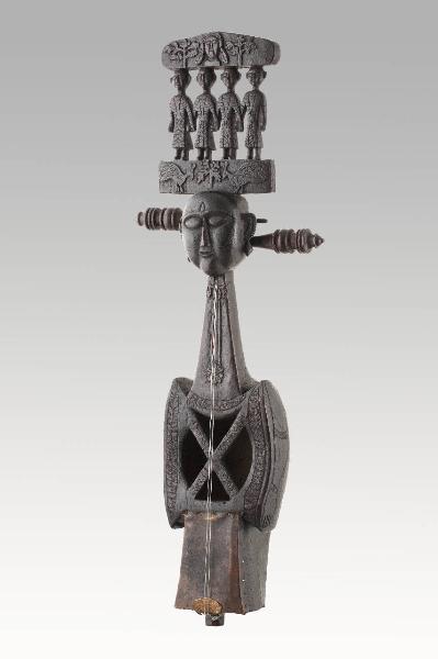 Dhodro Banam ad arco indiano (fidula monoxila verticale) con cassa armonica e manico ricavati da un unico pezzo di legno; forma antropomorfa femminile; sopra la testa sono presenti quattro figure stanti; piano armonico in pelle.