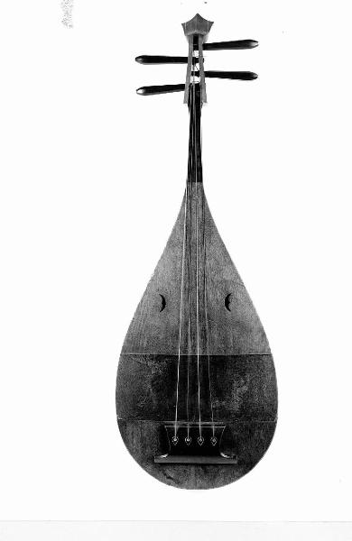 - NOTIZIE STORICO CRITICHE Luogo d'uso: Giappone\nSi tratta di un esemplare di una delle varietà del liuto piriforme giapponese derivato dal cinese p'ip'à, da cui differisce innanzitutto per la costruzione a cassa scavata a fondo piatto. Gli strumenti a cassa piriforme dal corto manico si ritiene provengano dalle Persia Sasanide, attraverso le steppe dell'Asia centrale. La tradizione vuole che il p'ip'a sia stato introdotto in Giappone dal grande suonatore Fujiwara Sadatoshi (807-867). Il biwa che ne è derivato ha preso strade diverse, divenendo, da una parte, col nome di gakubiwa, l'unico liuto del gagaku (orchestra di corte) e, dall'altra, lo heike-biwa, e cioè lo strumento di accompagnamento dello heikyoku, il canto epico attorno alle gesta degli eroi militari dell'epoca Heian. La principale differenza tra i due strumenti consiste nel numero e nelle dimensioni dei tasti: quelli dello heike-biwa sono cinque e sono più rilevati, dal momento che la pressione delle corde vi è esercitata nel tratto tra un tasto e l'altro; il maggiore distacco dal manico consente di modificare l'altezza della nota con effetto di glissato modificando la pressione delle dita, sino a ottenere differenze di una terza. Il gakubiwa, invece, prevede che le corde siano tastate in corrispondenza dello spigolo dei quattro tasti presenti, ottenendo così un suono preciso e timbricamente secco, tipico del gagaku. Dal momento che lo strumento in questione è privo dei tasti, non è possibile indurre dalla loro dimensione e numero se sittratti di un gakubiwa o di uno heike-biwa. Si può aggiungere peraltro che i gakubiwa sono molto più rari, essendo in partenza molto meno numerosi, e pertanto la loro presenza fuori del Giappone è certamente meno frequente e probabile di quanto non possa avvenire per gli heike-biwa.\nLa qualità di questo strumento fa rimpiangere lo stravolgimento che lo stesso ha subito a opera di un "restauro" arbitrario; si ritiene peraltro possibile ripristinare, se non l'originale struttura con le parti ormai sostituite, quanto meno il più corretto e congruo montaggio di quelle attualmente esistenti.