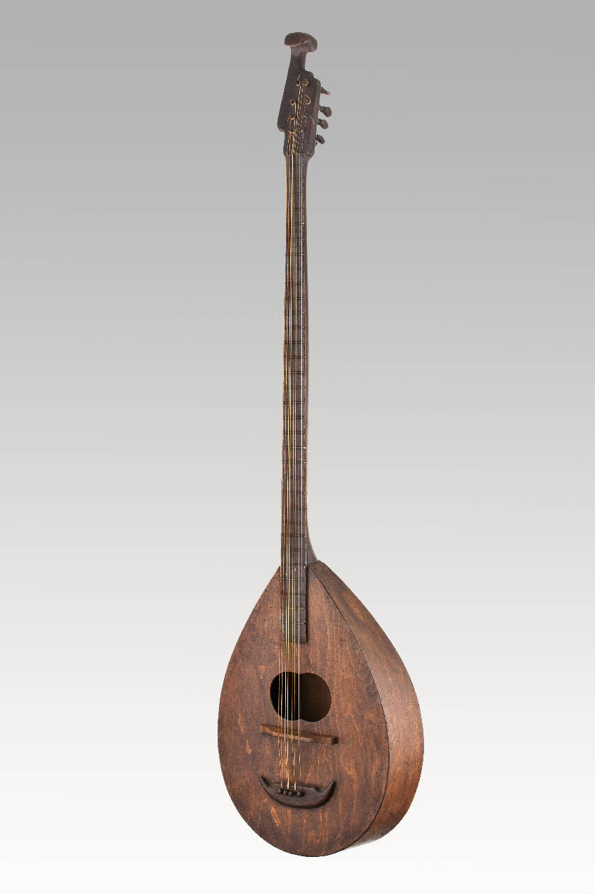 Pseudo liuto lungo con cassa di legno di forma ovale a fondo piatto su cui è applicata una sottilissima tavoletta di legno a taglio tangenziale che funge da piano armonico. Foro di risonanza ovale. Nella cassa si innesta il lungo manico con tastiera che termina nel piano armonico e costituita da trentadue tasti di metallo. Cavigliere a paletta rettangolare; otto caviglie; cordiera di legno a forma di mezzaluna con quattro fori in cui si inseriscono quattro cavigliette. Piccolo gancio di metallo infilato nel bordo inferiore della cassa.