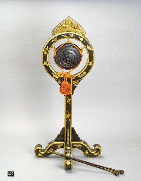 Gong con telaio circolare sostenuto da un supporto verticale poggiante su quattro gambe curvilinee, sagomate a forma di 'warabi-de' (gemme di felce); il tutto è di legno coperto di lacca dorata 'maki-e'. Il telaio è sormontato da un 'Kanagu', fregio di bronzo dorato 'tokin', che reca in rilievo una coppia di fenici 'hôô' e foglie di 'kiri' (paulownia). Fiori e foglie di kiri, realizzati con la tecnica 'usuniku-taka-maki-e' con polvere d'oro e d'argento, decorano anche la lacca nera del supporto e del telaio. Quest'ultimo sostiene per mezzo di un cordone nappato di seta rossa, un corpo vascolare di bronzo con la superficie esterna leggermente bombata con tre doppi cerchi concentrici in rilievo che racchiudono il rilievo del fiore di crisantemo imperiale.