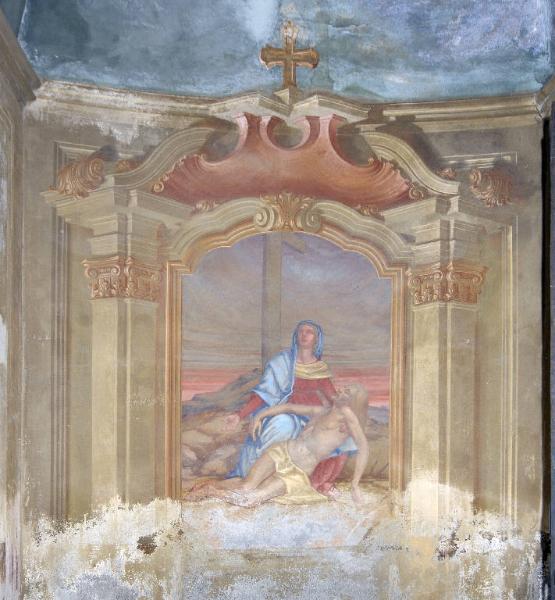 La Madonna, seduta a terra ai piedi della croce, sorregge il corpo di Cristo morto; sullo sfondo si vede un paesaggio roccioso al tramonto. La scena è inquadrata da una finta cornice mistilinea decorata da doppie paraste laterali con elaborati capitelli ionici e da una esuberante cimasa spezzata alla sommità.