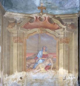 - NOTIZIE STORICO CRITICHE L'affresco mostra caratteri iconografici e stilistici - specialmente per quanto riguarda la cornice dipinta - risalenti al XVIII secolo, ma le figure e il paesaggio presentano segni di ridipinture relativamente recenti.