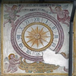 Affresco rettangolare recante un quadrante circolare con sole al centro e cornice decorata; agli angoli quattro angioletti (due sopra e due sotto) reggono cartigli con iscrizioni.