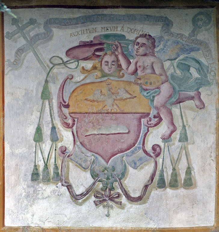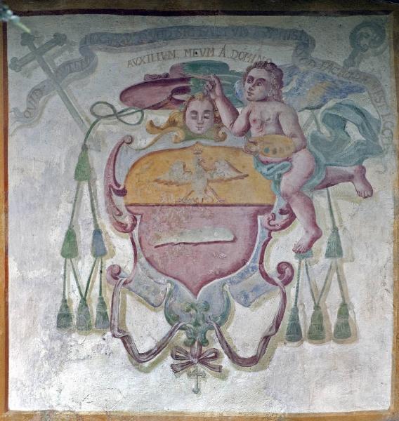 In una specchiatura rettangolare compare uno stemma sormontato da un cappello cardinalizio e affiancato da un angioletto con tavolozza e pennello. Superiormente svolazza un cartiglio con una iscrizione.
