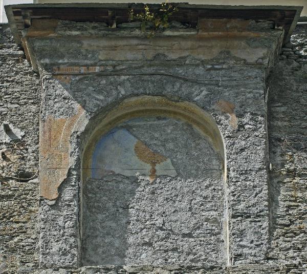 - NOTIZIE STORICO CRITICHE Il frammento si trova sulla parete di fondo di una edicola sul muro di contenimento del sagrato della chiesa parrocchiale, esposto ad est e visibile solo dalla via Risorgimento.