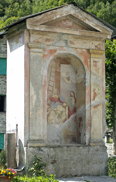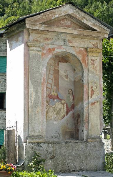 La composizione della scena, sulla parete di fondo, ruota attorno all¿immagine centrale di Gesù in grembo alla Vergine. A fare da sfondo alle figure è raffigurata la croce e teste d¿angelo. Le pareti laterali sono affrescate solo nella parte inferiore, dove si riconoscono due nicchie dalle quali emerge, a destra, un volto di donna con espressione dolente. Lungo la parete destra si rilevano ancora i cardini arrugginiti di un battente di protezione che è stato rimosso.
