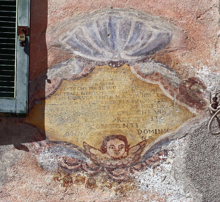 L¿affresco presenta una lunga iscrizione lacunosa racchiusa in una cornice dipinta di forma pressoché romboidale, coronata da una valva di conchiglia e inferiormente chiusa da una testa d¿angelo.