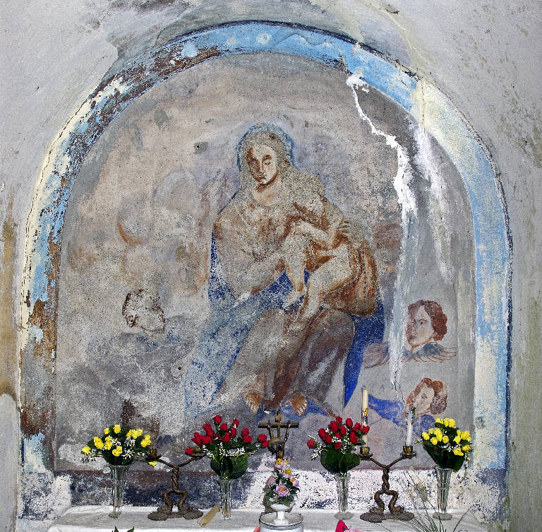 Il dipinto murale, sulla parete di fondo della cappella, è completato da due figure di santi affrescati sulle pareti laterali e rappresenta la madonna con Gesù Bambino su nuvole, tra teste di angioletti.