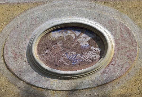 Il dipinto murale è inquadrato da una cornice in rilievo di forma ovale. Rappresenta due figure che riposano insieme a un gregge di pecore in un bosco. Nel centro è raffigurata una donna che dorme distesa a terra, con abiti azzurri, verso la quale è rivolto un pastore, seduto su sasso, a sinistra. La scena è inserita in una ricca vegetazione, tra alberi e cespugli.