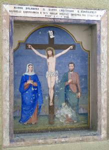 Il dipinto murale è inserito in una nicchia rettangolare ricavata nello spessore del muro. Rappresenta Gesù in croce, al centro, con la Madonna a sinistra e San Bartolomeo a destra. La Vergine è vestita di rosso e reca un mantello blu sulle spalle e un velo bianco sul capo, mentre il Santo tiene un libro nella mano sinistra ed un coltello nella destra. Sullo sfondo è rappresentato un paesaggio montano molto semplice e schematizzato.