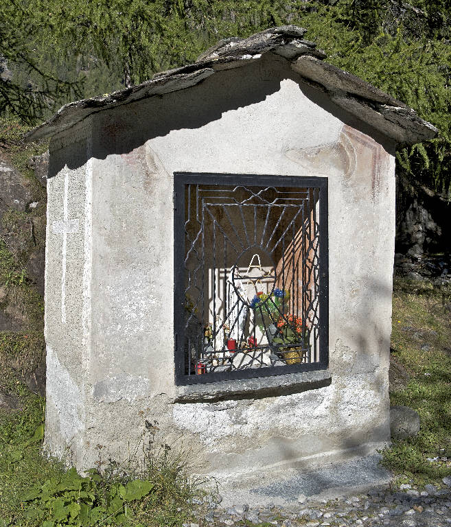 Nella nicchia interna si trovano affreschi lacunosi: sulla parete di fondo la Madonna con Gesù Bambino appare a un santo inginocchiato, che indossa un saio; sulla parete sinistra, invece, si vede un altro santo non identificabile.