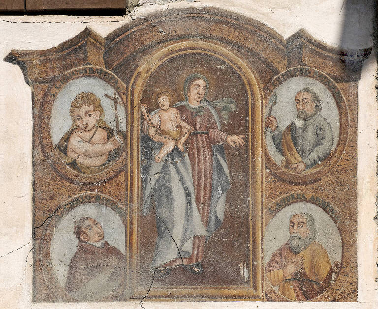 In una sorta di polittico dipinto di forma sagomata compaiono: al centro la Madonna, in piedi, con Gesù Bambino; lateralmente, in alto a sinistra San Giovannino e, in alto, a destra, San Giuseppe, in basso a sinistra San Carlo Borromeo e, in basso, a destra, Sant'Andrea.