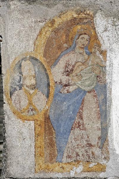 - NOTIZIE STORICO CRITICHE La Madonna e Gesù Bambino riprendono le fattezze e le attitudini della statua della Madonna conservata nel Santuario della Beata Vergine della Grazie a Primolo, scolpita da Giovan Battista Zotti e solennemente incoronata l¿11 agosto 1765 per decreto del Capitolo di San Pietro in Vaticano. A partire da questa data il culto per la Madonna Madonna di Primolo si intensificò in tutta la valle, come è testimoniato dal dipinto murale in esame.