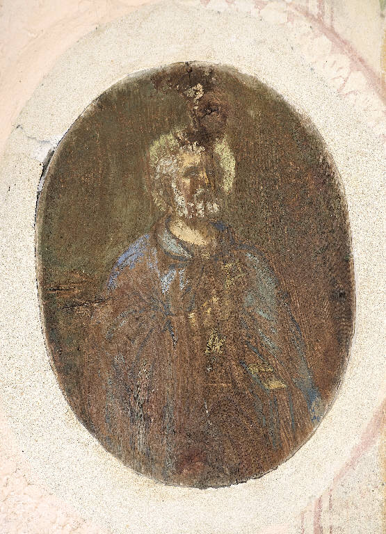 Su una tavola lignea incassata nel muro, decorata esternamente con un fregio, è raffigurato il busto di San Pietro, leggermente girato verso destra, dove sta la Crocifissione ad affresco.