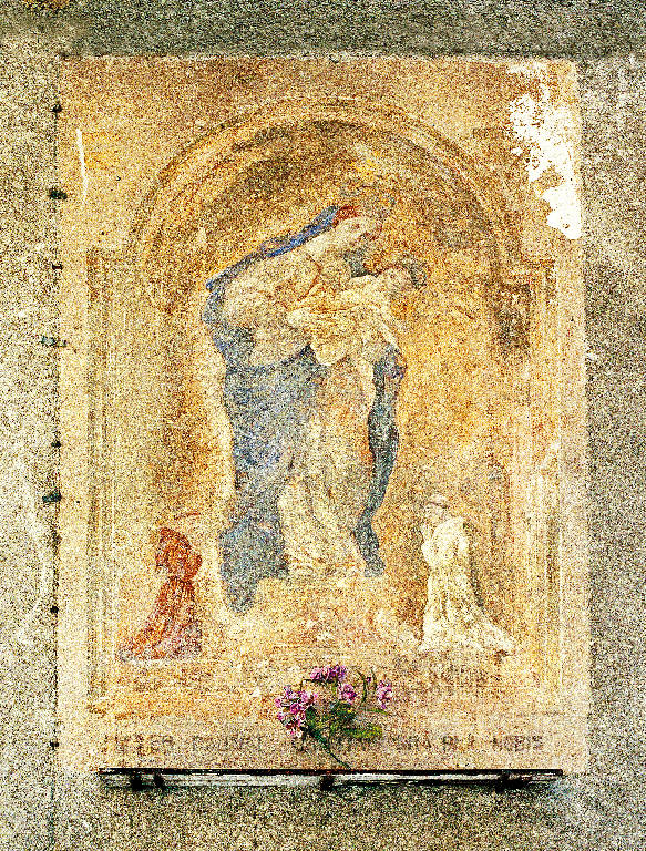- NOTIZIE STORICO CRITICHE La Madonna e Gesù Bambino riprendono le fattezze e le attitudini della statua della Madonna conservata nel Santuario della Beata Vergine della Grazie a Primolo, scolpita da Giovan Battista Zotti e solennemente incoronata l¿11 agosto 1765 per decreto del Capitolo di San Pietro in Vaticano. A partire da questa data il culto per la Madonna Madonna di Primolo si intensificò in tutta la valle, come è testimoniato dal dipinto murale in esame. Per questo motivo non si può ritenere accettabile (cfr. Masa, 2007) la data 1746, riferita a questo affresco in Pavesi (Pavesi, 1969, 168) che ricorda pure i restauri effettuati nel 1936.