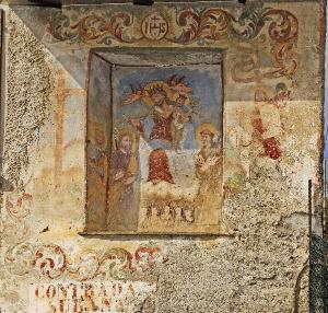 - NOTIZIE STORICO CRITICHE L'affresco è posto in posizione ben visibile sul fronte est di un edificio isolato, situato lungo il vecchio sentiero pedonale che collegava il paese alla contrada Surana e che, attualmente, è costeggiato dalla strada carrozzabile che conduce sul comune di Montagna. Particolare risalto assume la figura di San Fedele a cavallo, che fu soldato della legione Tebea. Egli, dunque, come altri santi ricordati come legionari tebani, avrebbe dovuto - secondo una leggenda - massacrare i Galli già cristianizzati, ribellatisi ai Romani pagani. Il rifiuto e conseguente martirio assume "anche il significato dell'impegno contro la tracotanza dei dominatori e la persecuzione religiosa" (Bertoletti-Moretti-Zucchi, 2004, 107).