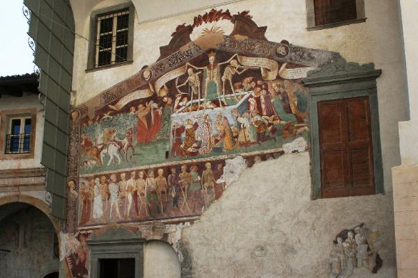 Sulla grande parete a destra del portico dell'Oratorio dei disciplini sono raffigurati una serie di affreschi che sviluppano una sintesi dei temi della Morte. Su tre registri sono rappresentati: il Trionfo della Morte con l'Incontro dei tre vivi e dei tre morti (I registro), la Danza macabra (II registro) e quel poco che resta, a seguito di costruzioni e rimaneggiamenti subiti successivamente dalla parete, dei Vizi capitali e dell'Inferno che dovevano contrapporsi alle Virtù e al Paradiso (III registro).