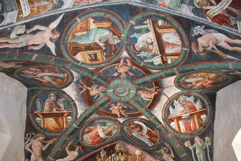 - NOTIZIE STORICO CRITICHE Spesso gli affreschi del presbiterio dell'Oratorio dei disciplini sono passati in secondo piano rispetto al ciclo delle Storie della vita di Cristo - eseguiti sempre all'interno dell'edificio - o ai ben più noti affreschi esterni del Trionfo della Morte e Danza Macabra. \nNé le decorazioni della volta del presbiterio né quelle del sottarco d'accesso recano alcuna data, è stata però opinione comune della critica assegnare questo ciclo a un momento successivo rispetto alle storie cristologiche, sottolineandone la maturità stilistica e la maggior sicurezza, evidente soprattutto nella capacità del frescante nel saper meglio gestire gli spazi con effetti illusionistici e scorci prospettici. Un'evoluzione che colloca questi affreschi più in prossimità dello stile dei temi macabri esterni. \nLa tendenza degli studi più recenti è stata però quella di assegnare tutti gli affreschi del complesso a un unico autore, identificandolo in Giacomo Busca detto il Borlone, e giustificando i palesi scarti stilistici, non solo ammettendo l'esecuzione dei cicli pittorici in tempi diversi, ma motivando anche la varietà delle mani presenti come una normale prassi di lavoro eseguito da una bottega, dove accanto a un maestro principale collaboravano tutta una serie di assistenti e aiuti ai quali possono essere imputati i livelli qualitativi più mediocri.