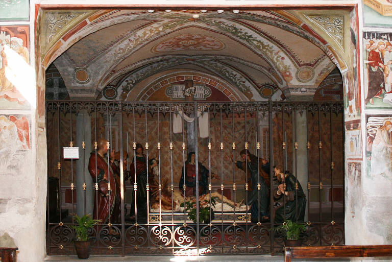 - NOTIZIE STORICO CRITICHE Gli affreschi all'interno dello scurolo dell'Oratorio dei disciplini e sull'intradosso dell'apertura che mette in comunicazione tale vano con la navata appartengono a mani ed epoche diverse. \nVi sono pitture certamente più antiche, come la sinopia con San Girolamo, l'affresco soggiacente alla lunetta con San Paolo tra San Lorenzo e Sant'Antonio abate e gli affreschi sull'intradosso, che benché certamente eseguiti da aiuti e collaboratori possono essere ritenuti coevi alle Storie della vita di Cristo della navata dell'oratorio. Le due lunette raffiguranti santi, per la presenza della data 1512 impressa nel libro sorretto da San Bernardino da Siena, sono invece certamente risalenti a una campagna decorativa successiva.\nDagli atti della visita apostolica di San Carlo Borromeo nel 1575 si apprende della presenza di un altare dedicato a San Girolamo che "habet iconam veterem in pariete", quasi certamente l'affresco nello scurolo di cui oggi ci resta solo la sinopia. San Carlo ordinerà la rimozione di tale altare, tuttavia nel 1639 esso ancora persisteva se un altro visitatore vescovile in tale data ne ribadiva nuovamente la demolizione.