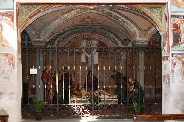 All'interno dello scurolo dell'Oratorio dei disciplini (corpo più antico della chiesa), separato dalla navata da un'apertura chiusa da una cancellata in ferro, accanto a una decorazione ottocentesca simulante finte architetture e finti arazzi, sono presenti alcuni affreschi più antichi: una sinopia raffigurante San Girolamo, una lunetta con San Bernardino da Siena tra San Rocco e San Sebastiano e una lunetta con San Paolo tra San Lorenzo e Sant'Antonio abate.\nAnche l'intradosso dell'apertura che mette in comunicazione i due distinti vani presenta alcune pitture: una Madonna con il Bambino molto rovinata, gli utensili di un fabbro, un celebrante con un devoto e un'altra Madonna con il Bambino.