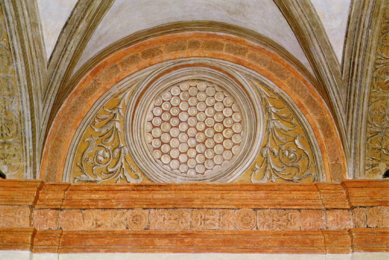 Lungo le lunette delle navate laterali della chiesa di Santa Maria presso San Satiro sono emersi, durante gli ultimi restauri, clipei affrescati. In particolare nella navata laterale di destra, in corrispondenza delle pareti della sacrestia, sono ora visibili, in tre lunette sopra la trabeazione, tre oculi dipinti con motivi che simulano finte vetrate. \nAll'interno di oculi modanati sono raffigurate finte vetrate a rulli legati a piombo. Gli spazi laterali della lunetta sono campiti da rameggi vegetali terminanti in girali.