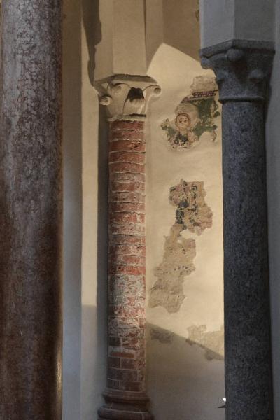 • NOTIZIE STORICO CRITICHE Gli affreschi interni al sacello di San Satiro appartengono a periodi differenti. Le decorazioni vegetali delle voltine, le figure di santi nell'angolo a sinistra dell'altare maggiore, le croci in quello di destra e i quattro santi negli angoli ai lati dell'entrata, sono secondo la critica tutti verosimilmente databili alla fine del IX secolo, benché gli ultimi si distinguano per una maggior monumentalità e ieraticità. All'inizio del XI secolo spetterebbero le due figure e la decorazione a racemi stilizzati nella parte inferiore delle due nicchie dell'angolo a destra dell'altare. Alla metà del XIII secolo è invece datata la Madonna in trono con il Bambino benedicente con paralleli avanzati dagli studiosi con la Madonna con il Bambino affrescata nella Cappella Cittadini della chiesa di San Lorenzo Maggiore. \nI lacerti furono tutti rimessi in luce durante i restauri operati da Gino Chierici fra il 1939 e 1942. In quell'occasione infatti, volendo ripristinare l'interno del sacello alle forme altomedioevali, vennero eliminate tutte le decorazioni successive, sia quelle quattrocentesche, sia quelle più tarde. Inoltre furono demolite le volte dei vani angolari riscoprendo, a una quota più alta, le voltine originali affrescate a motivi vegetali. Anche gli affreschi più tardi, posti ai lati dell'entrata, furono rinvenuti eliminando i riallineamenti eseguiti nella seconda metà del Quattrocento per raccordare il sacello con il transetto della nuova chiesa di Santa Maria. In particolare, i frammenti dove si riconosce un Cristo nell'atto di benedire un gruppo di devoti inginocchiati, ora presenti sulla parete a sinistra dell'entrata, erano in origine sulla destra e coprivamo l'affresco con la Madonna in trono con il Bambino benedicente. Staccati, per scoprire l'affresco sottostante, furono ricollocati poi sulla parete di fronte. Durante il secondo conflitto mondiale l'integrità dell'interno dell'edificio fu fortemente compromessa dalla distruzione dei vetri del lanternino ripristinati solo nel 1958. Un'ultima campagna di restauri compiuta fra il 1982 e il 1989 ha interessato tutto il sacello e in particolare gli affreschi interni con l'eliminazione dei più gravi difetti di adesione dell'intonaco al supporto murario e con un consolidamento e successiva pulitura di tutta la pellicola pittorica, andando a rimuovere, dove necessario, tutte le sovrammissioni operate nei restauri precedenti.