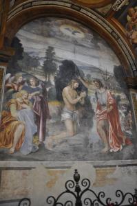 La parete di fondo rappresenta il Battesimo di Cristo da parte di San Giovanni, personaggio a cui è dedicato l'intero spazio sacro della cappella in esame. L'episodio, arricchito dalla presenza di quattro angeli sulla destra che reggono le vesti di Gesù, si svolge tutto in primo piano, mentre lo sfondo si apre su una affascinante veduta paesaggistica, contraddistinta da elementi naturalistici (alberi, colline e monti) e da alcuni segni della presenza umana (rovine antiche, un castello, alcune case, un ponte e una città in lontananza). Le pareti laterali della cappella presentano due episodi relativi alla vita di san Giovanni, quale l'Imposizione del nome del Battista, mentre a destra il suo martirio, avvenuto per decollazione. Nella figura di Zaccaria impegnato a scrivere il nome del Battista è stato riconosciuto il ritratto del committente, il marchese Francesco Carreto.