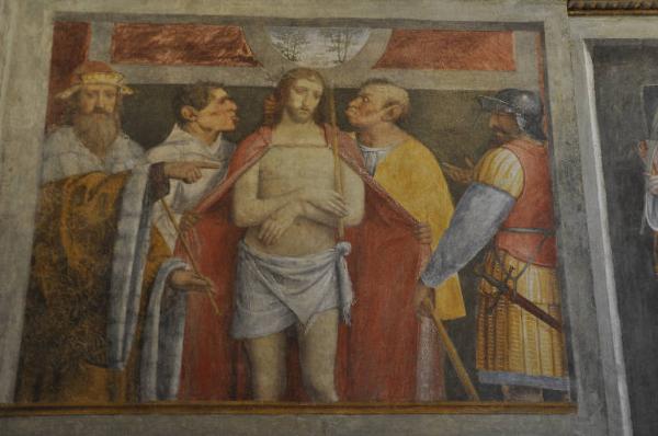 - NOTIZIE STORICO CRITICHE Rispetto allo stile dismogoneo che caratterizza la maggior parte degli affreschi della parete divisoria della chiesa claustrale, questa raffigurazione sembra essere di qualità più alta, e quindi è da riferirsi alla mano di Bernardino Luini, sia pur nella fase tarda della sua attività, quando, nell'ultimo quinquennio del terzo decennio del Cinquecento, il pittore viene assistito dalla bottega in fase realizzativa. Qui Luini sfrutta abilmente la posizione non eccessivamente elevata della scena per coinvolgere direttamente lo spettatore-fedele, che osservando l'episodio si trova confinato dalla parte dei Giudei, di coloro cioè che avrebbero di lì a poco condannato Gesù. Ad accentuare la carica emotiva contribuiscono anche le espressioni caricate degli astanti che scherniscono il Signore, al limite del grottesco; qui Bernardino dimostra di saper fornire una personale interpretazione agli studi studi leonardeschi di fisiognomica.