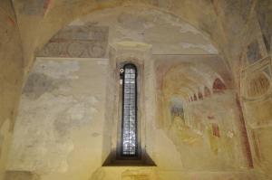 - NOTIZIE STORICO CRITICHE Dal punto di vista stilistico le pitture masoliniane mostrano tutti gli elementi tipici del suo linguaggio, a partire dalle luminose cormie e dalla delicata modulazione chiaroscurale delle figure, che si inseriscono nello spazio in un modo disinvolto, che non tiene per forza conto dei reali parametri proporzionali, per dare invece il massimo risalto all'efficacia narrativa degli eventi che si susseguono. E' stato giustamente rilevato che l'architettura della scena sia decisamente più complessa rispetto a quella che caratterizza un altro episodio presente nel Battistero, vale a dire quello di Erode presente sulla parete opposta. Il ricorso alle lunette consente di allacciare rapporti con l'antica basilica di San Giovanni in Laterano a Roma, caratterizzata, prima dei pesanti interventi seicenteschi, da ampie finestre semicircolari che davano luce alla navata mediana. Il riferimento all'architettura di San Giovanni trova conferma nel fatto che il ciclo pittorico di Castiglione Olona si ispira, per concezione e per comunanza iconografica, a quello realizzato da Gentile da Fabriano e poi concluso da Pisanello nella medesima basilica lateranense. La scena dell'imposizione del nome del Battista denota una differenza consistente nella concezione spaziale, risolta non più in senso gotico ma secondo il recupero di modi all'antica; il contesto nel quale ambienta l'episodio affrescato tiene inoltre conto dei reali elementi presenti nel Battistero, così che le figure sembrano finalmente occupare un ambiente reale. E' stato ipotizzato che in questa scena Masolino fosse assistito, limitatamente all'intelaiatura architettonica e prospettica, da un collaboratore, probabilmente da quel Lorenzo di Pietro detto il Vecchietta che collaborò con lui anche negli affreschi del palazzo del cardinale, sempre a Castiglione Olona.