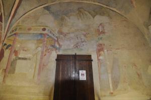 La controfacciata del Battistero, pur presentandosi in precarie condizioni di conservazione, consente di individuare l'inizio della sequenza narrativa dedicata alla vita di san Giovanni che si dipana su tutte le pareti del medesimo edificio. In particolare la parete d'ingresso presenta, a sinistra, la scena dell'Annuncio a Zaccaria, dove è ancora visibile l'architettura del tempietto a ciborio, mentre a destra la Visitazione. Collega questi due settori la parte centrale, dove prende luogo una straordinaria veduta cittadina, chiaramente relativa a Roma, resa topograficabilente riconoscibile da edifici quali il Pantheon e il Campidoglio, ma anche da altri monumenti cristiani come le chiese di Santa Maria in Aquiro e di Santa Maria sopra Minerva, oppure presenze medievali tradizionali come la torre delle Milizie.