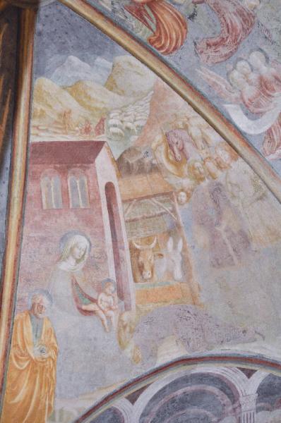 - NOTIZIE STORICO CRITICHE La scena denota il linguaggio di Masolino, che si attesta su due livelli espressivi tra di loro in equilibrio: da una parte la ricerca di eleganza formale, percepibile nell'uso della linea, fluida e morbida, dei panneggi delle figure che ricadono in terra formando ampie volute; dall'altra una sensibilità cromatica che non aveva pari nella pittura lombarda della prima metà del Quattrocento (se si eccettua l'attività di Michelino da Besozzo e il passaggio bresciano di Gentile da Fabriano). E' stato osservato che Masolino dovette avere presenti i rilievi della Porta del Paradiso di Lorenzo Ghiberti, da cui dipendono, negli affreschi della Collegiata, i rapporti tra le figure e le architetture, la cadenza ritmica dei panni e dei gesti, il modo assorto dei personaggi di partecipare all'azione. A Castiglione emergono dunque i ricordi fiorentini dell'artista, come indirettamente conferma il fatto che la posizione del Re chinato a terra in atto di baciare il piede del Bambino sia un'invenzione ripresa (ma forse derivata da un comune modello?) da Domenico Veneziano. L'architettura di sfondo, che delinea uno splendido edificio traforato, è stata riferita alla mano del senese di Masolino, Lorenzo di Pietro detto il Vecchietta, cui è attribuibile anche l'esecuzione della figura di Giuseppe.