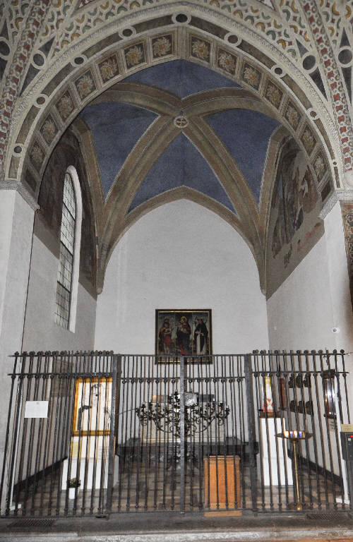 - NOTIZIE STORICO CRITICHE Scoperti soltanto nel 1928, gli affreschi, ormai leggibili in uno stato di conservazione seriamente compromesso, consentono tuttavia di verificare ancora il loro elevato livello qualitativo, che qualifica la cappella come uno dei luoghi artistici più interessanti, ancorché un po' trascurati, della chiesa di Santa Maria delle Grazie. Sul piano dello stile si può ragionevolmente immaginare all'opera un pittore influenzato dalle architetture bramantesche, come si evince dalla notevole padronanza esibita nella scienza della prospettiva, benché le scene all'interno delle medesime lunette non siano quasi mai unificate dal punto di vista centrale. Si tratta, dunque, di un'interpretazione libera e ancora un po' impacciata della somma lezione di Bramante, sviluppata evidentemente da un maestro locale propenso a esibire un gusto fortemente antichizzante e denso di rimandi antiquariali, in passato identificato con Donato Montorfano (anche per via della famosa Crocefissione presente nel refettorio delle Grazie, sulla parete opposta rispetto a quella dell'Ultima cena di Leonardo) e più recentemente con Cristoforo de' Mottis, ma senza certezze. Le figure si caratterizzano inoltre per un accentuato senso plastico e una cer amonumentalità, derivata probabilmente dalla conoscenza di altri maestri attivi a cavallo tra Quattro e Cinquecento, come il bresciano Vincenzo Foppa e Ambrogio da Fossano detto il Bergognone; non è da escludere che l'anonimo pittore attivo nella prima cappella sinistra delle Grazie si fosse formato a contatto con il cantiere della Certosa di Pavia. Gli affreschi furono eseguiti intorno all'ultimo decennio del Quattrocento (probabilmente sostituendo una modesta decorazione di poco più antica), epoca in cui morì il giureconsulto Francesco Bolla (personaggio legato a Gian Galeazzo Sforza), ma non furono terminati, forse perché lasciati interrotti alla caduta di Ludovico il Moro, nel 1499. Nell¿angolo a destra vicino alla cancellata in una nicchia di marmo, dal 1972 si conserva la reliquia della cappa di santa Caterina da Siena. Di recente come pala d¿altare è stato collocato un trittico su tavola firmato "M. NICOLAUS CREMONENSIS" e datato 1520 sul cartellino al centro.