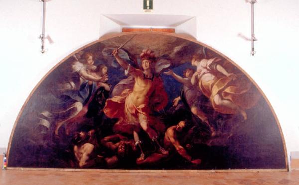 L'arcangelo è raffigurato in posizione centrale. Intorno a lui c'è un turbine di angeli che partecipano al suo trionfo. Ai suoi piedi si trova il diavolo riverso e incatenato.