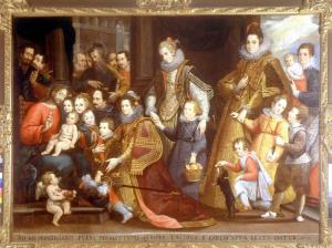 - NOTIZIE STORICO CRITICHE La tela proviene dal legato di Carlotta Olginati, nel cui inventario viene descritto come "Un quadro grande, che rappresenta l'antica famiglia della casa Olginati fato del Cinquecento, con cornice nera e fogliami adorati, di incerto autore" (Casati, 2002, 10). \nGiulio Bora (Bora, 1981) e Marialuisa Rizzini (Rizzini, 1989) concordano nell'associare questo dipinto, per analogie di dimensioni e di caratteristiche stilistiche, ad altri due raffiguranti Sant'Elena ritrova la vera croce e la Nascita di S. Giovanni Battista pervenuti nella collezione dei Musei Civici di Como attraverso il legato Olginati (1931). Entrambi gli studiosi, inoltre, lo attribuiscono a un ignoto artista di origine fiamminga o olandese sensibile alle influenze del giovane Cerano e del Procaccini, ma ancora esente dalle suggestioni morazzoniane e giustificando, in tal modo, la datazione della tela in esame all'inizio del Seicento. \nPer quanto concerne la provenienza, il Bora (Bora, 1981, 66) non esclude che il dipinto possa essere stato eseguito per la cappella del Rosario della distrutta chiesa di S. Giovanni in Pedemonte di Como sottoposta al patronato della famiglia di Laura Coquio, madre di Alessandro Olginati. Diversamente, la Rizzini (Rizzini, 1989, 99) ipotizza la provenienza dell'opera dalla cappella annessa ad un ignoto palazzo nobiliare non necessariamente appartenuto alla famiglia Olginati. Infine Alberto Rovi (Rovi, 1999, 132), ribadendo che questa tela insieme alla Nascita di S. Giovanni Battista (inv. 474) potevano essere i quadri laterali di una cappella la cui pala fosse il Ritrovamento della vera croce, vi rintraccia elementi stilistici riconducibili al campionese Isidoro Bianchi. Lo studioso, in particolare, rileva analogie tra il gruppo degli apostoli e degli angeli sullo sfondo e il gruppo della donna con la bambina tenuta per mano nel santuario di S. Maria dei Ghirli a Campione d'Italia.