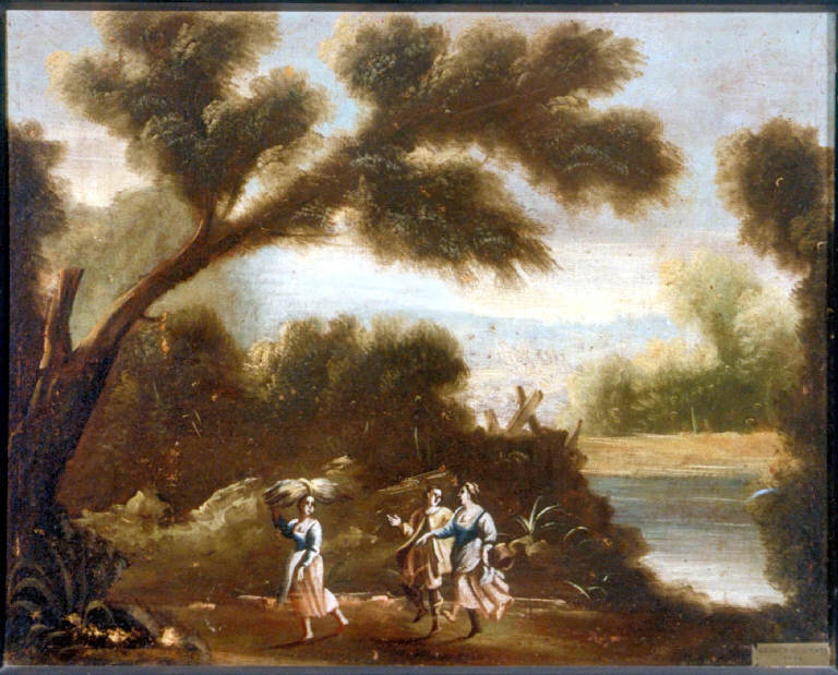 - NOTIZIE STORICO CRITICHE Il dipinto fa pendant con una tela di soggetto analogo e di uguali dimensioni pure appartenente alle collezioni dei Musei Civici di Como. La rappresentazione del paesaggio, con un grande albero in primo piano inclinato ad incorniciare il gruppetto di contadine che si muovono con passo allegro, non risulta troppo particolareggiata. La resa della vegetazione, poco analitica e definita, esibisce vaghi ricordi della tradizione seicentesca del paesismo romano, innestati su una matrice naturalistica lombarda.
