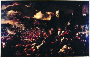 E' raffigurata una concitata battaglia di cavalleria tra eserciti, con il profilo di una città sullo sfondo.