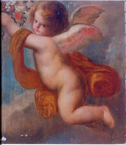 Un angioletto compare in volo, rivolto verso sinistra ed avvolto in un panno svolazzante.